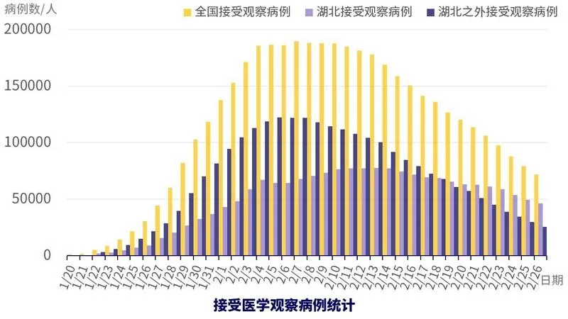 還值得關(guān)注的是正在接受醫(yī)學(xué)觀察的人數(shù),在全國(guó)嚴(yán)格管控的情況下,未來(lái)新增確診病例很大比例會(huì)來(lái)自這部分人群。從數(shù)據(jù)中可以看到,非湖北地區(qū)接受醫(yī)學(xué)觀察人數(shù)正在快速下降,湖北地區(qū)的也在穩(wěn)步下降中,這可能預(yù)示著未來(lái)新增確診病例也將下降。