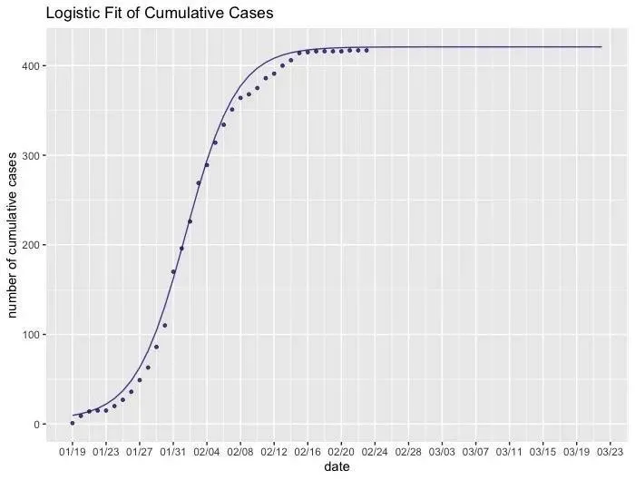 進(jìn)一步地?cái)M合深圳新冠肺炎的累計(jì)確診人數(shù),并對(duì)累計(jì)確診人數(shù)做出預(yù)測(cè)??梢钥吹?,模型預(yù)測(cè)自2月28日起病例數(shù)不再增加,預(yù)測(cè)得到最終的累計(jì)確診人數(shù)收斂在422人左右。