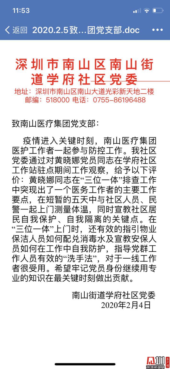 南山區(qū)南山街道學府社區(qū)黨委對黃曉娜的表揚信