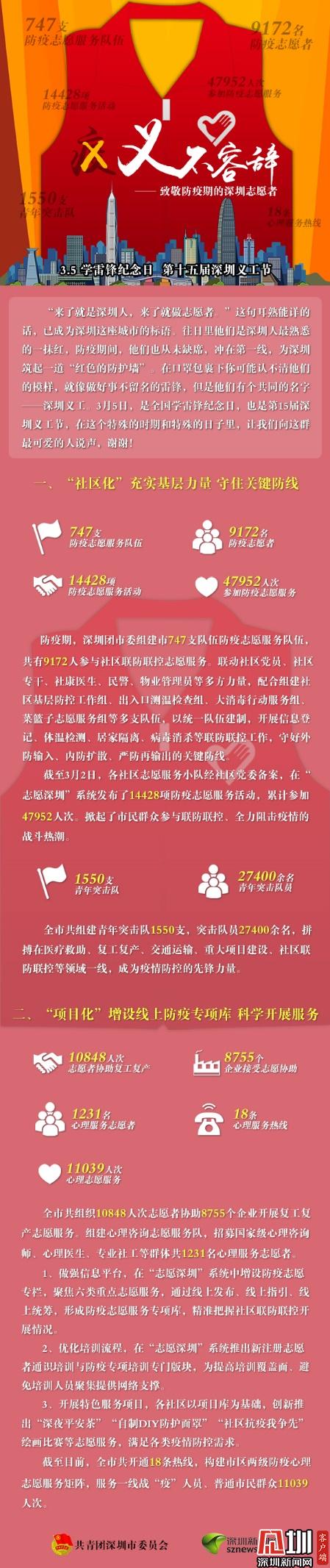 據(jù)了解,防疫期間,深圳團市委組建747支防疫志愿服務隊伍,共9172人參與社區(qū)聯(lián)防聯(lián)控志愿服。截至3月2日,各社區(qū)志愿服務小隊經(jīng)社區(qū)黨委備案,在“志愿深圳”系統(tǒng)發(fā)布了14428項防疫志愿服務活動,累計參加47952人次。在深圳戰(zhàn)“疫”的關鍵時刻,全市共組建青年突擊隊1550支,突擊隊員27400余人,拼搏在醫(yī)療救助、復工復產(chǎn)、交通運輸、重大項目建設、社區(qū)聯(lián)防聯(lián)控等領域一線,成為疫情防控的先鋒力量。