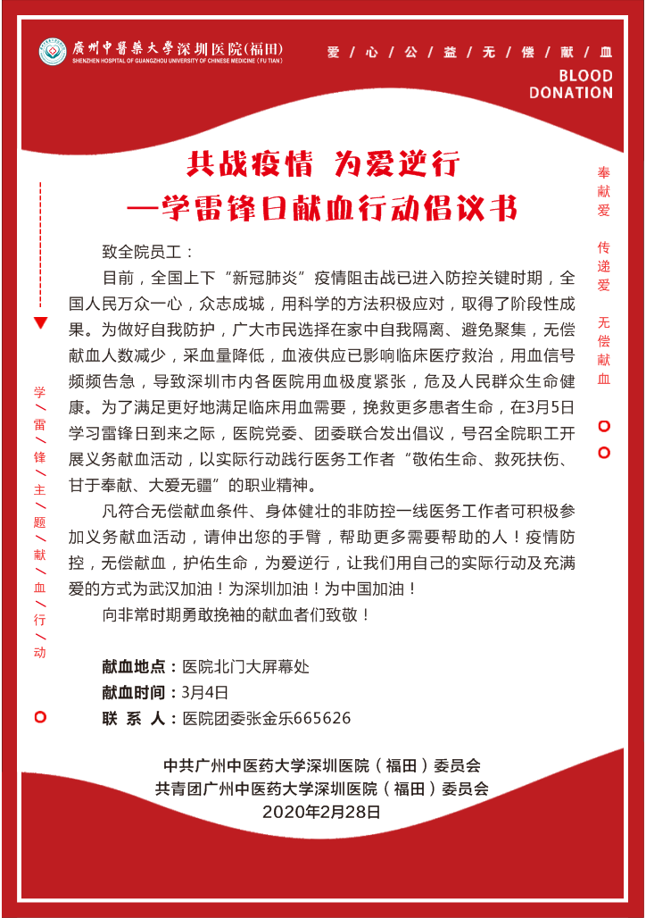 深圳新聞網(wǎng)3月5日訊(見圳客戶端、深圳新聞網(wǎng)記者 何靜 通訊員 馬曉群)受疫情影響,深圳市內(nèi)的血站頻頻告急,在這非常時期,為了更好地滿足深圳市臨床用血需要保障市內(nèi)血液供應(yīng),挽救更多患者生命,恰逢第57個“3.5學(xué)雷鋒日”到來之際,廣州中醫(yī)藥大學(xué)深圳醫(yī)院黨委、團委聯(lián)合發(fā)出“共戰(zhàn)疫情,為愛逆行”倡議書,號召全院職工開展無償獻血活動。