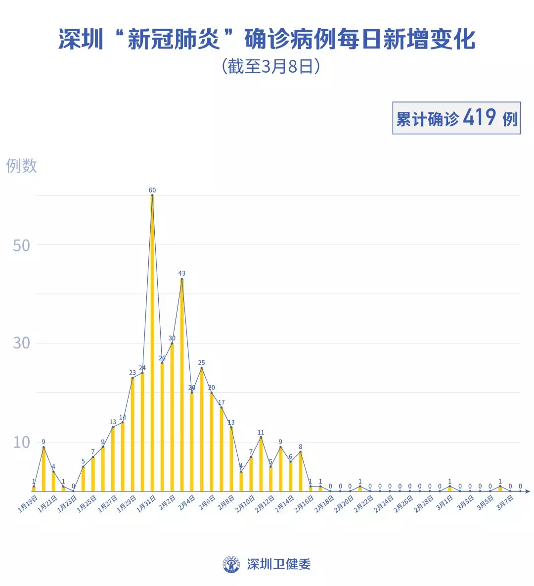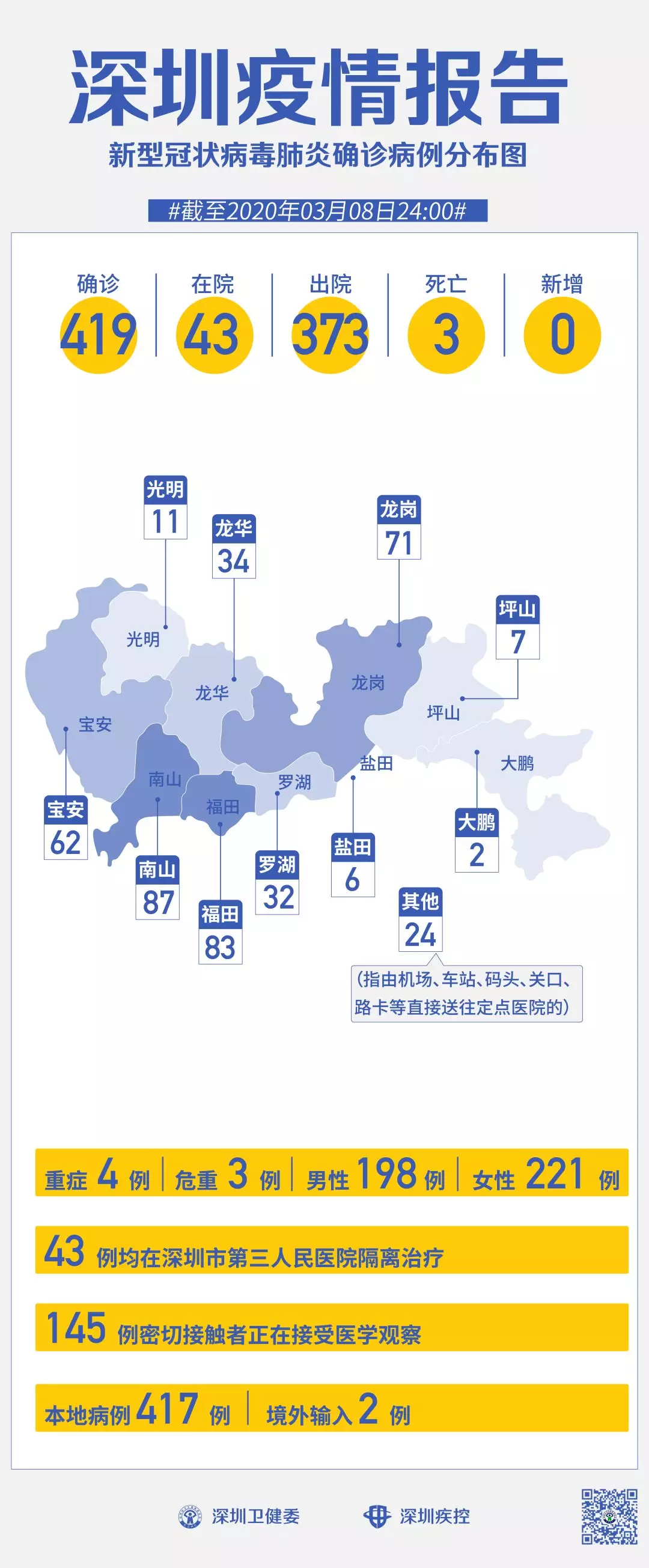 截至3月8日24時,深圳累計報告“新冠肺炎”確診病例419例。3月8日當天全市無新增確診病例,當天出院病例5例(從2月26日起不再公布出院個案)。