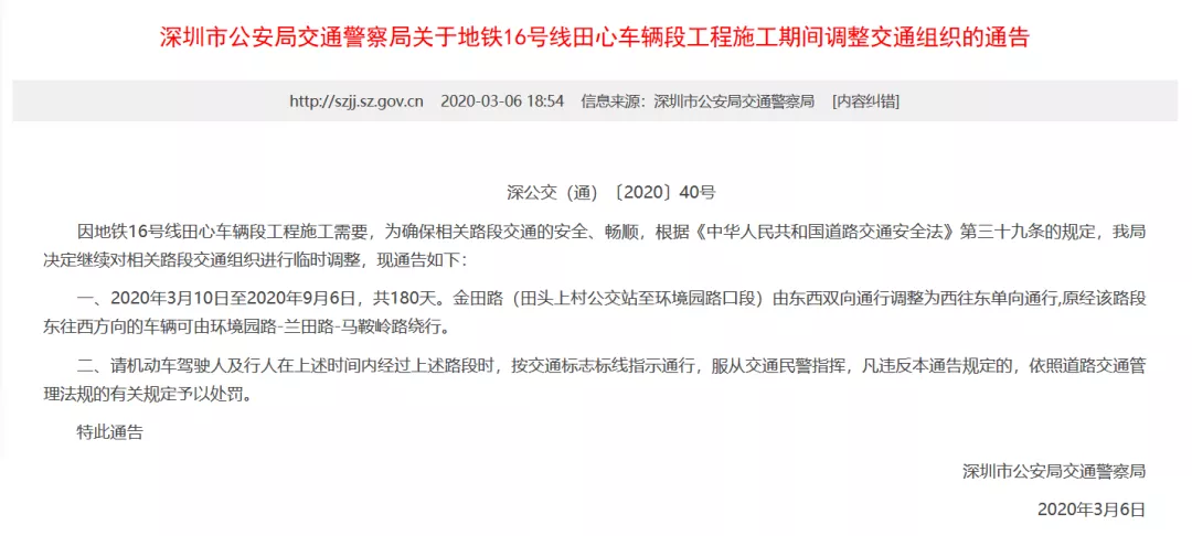 2020年3月10日至2020年9月6日,共180天。金田路(田頭上村公交站至環(huán)境園路口段)由東西雙向通行,調(diào)整為西往東單向通行。
