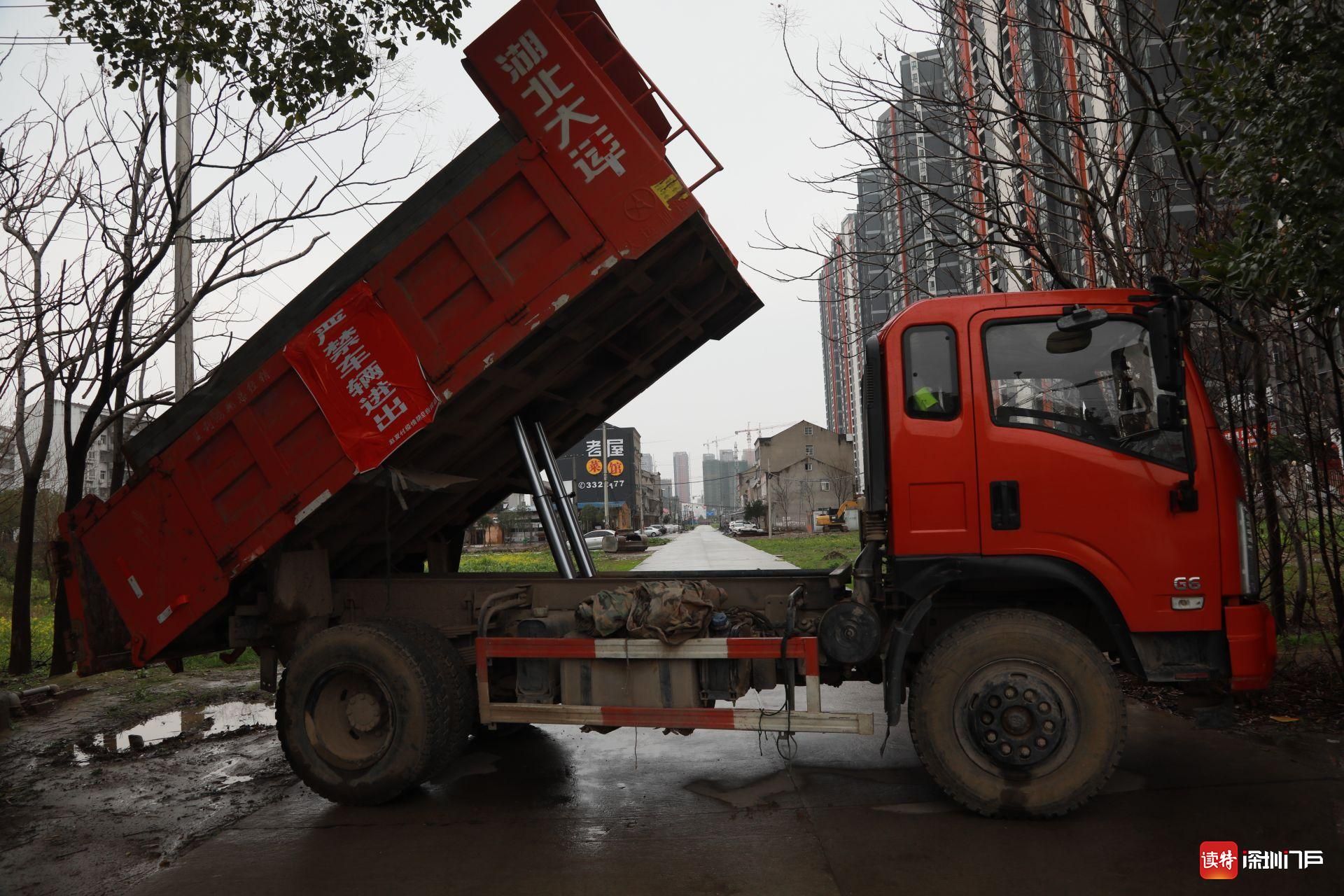 2月26日,監(jiān)利,用于隔斷交通的大貨車。