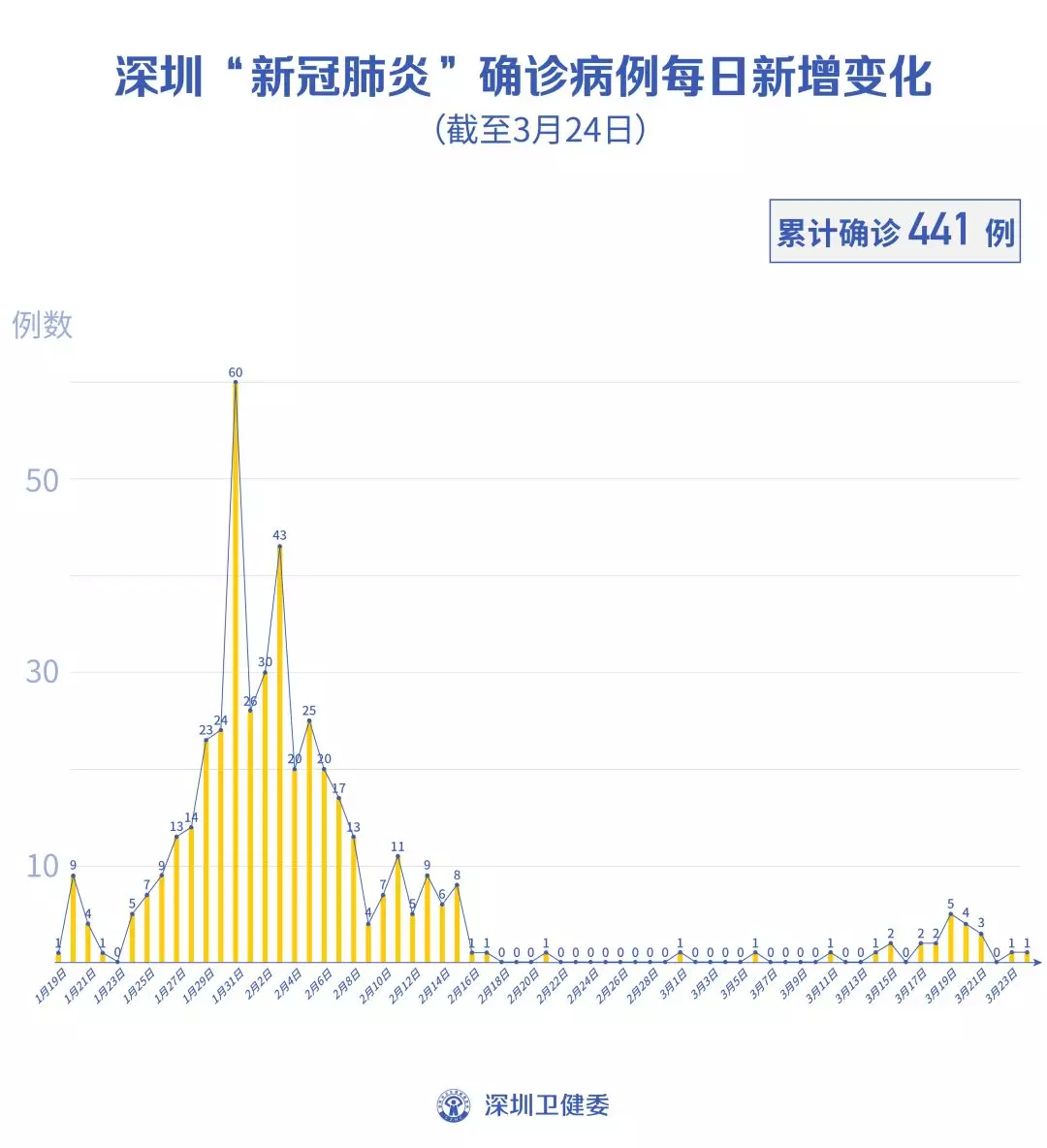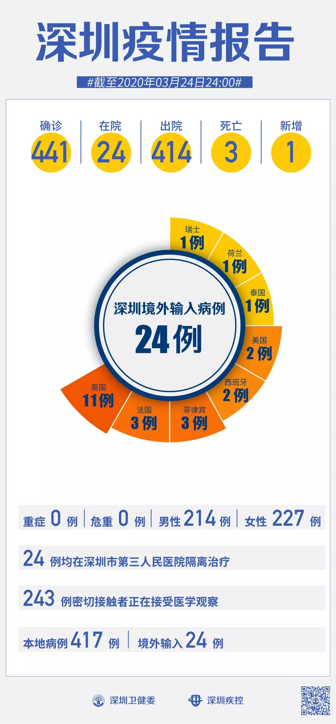 3月24日,深圳確診1例境外輸入“新冠肺炎”新病例,累計(jì)達(dá)24例。 病例24 男,31歲,巴西籍,在深圳工作,由英國返回。3月21日從英國倫敦乘坐SQ305航班飛往新加坡,22日從新加坡乘坐CZ3040航班飛往中國廣州,當(dāng)晚經(jīng)廣州白云機(jī)場(chǎng)入境,入境體溫36.6℃。23日凌晨由專車送往深圳集中隔離觀察,24日新冠病毒核酸初篩陽性,當(dāng)天深圳市疾控中心復(fù)核亦為陽性。 目前患者已被轉(zhuǎn)到深圳市第三人民醫(yī)院隔離治療。經(jīng)初步判定,在中國內(nèi)地有32名密切接觸者,已集中隔離。 截至3月24日24時(shí),深圳累計(jì)報(bào)告“新冠肺炎”病例441例。3月24日當(dāng)天新增1例。 累計(jì)報(bào)告確診病例中,男性214例、女性227例。 目前,死亡3例,累計(jì)出院414例。 24例確診病例均在深圳市第三人民醫(yī)院隔離治療。 243名密切接觸者正在接受醫(yī)學(xué)觀察。 資料來源:深圳市疾控中心、深圳市衛(wèi)健委、廣東省衛(wèi)健委