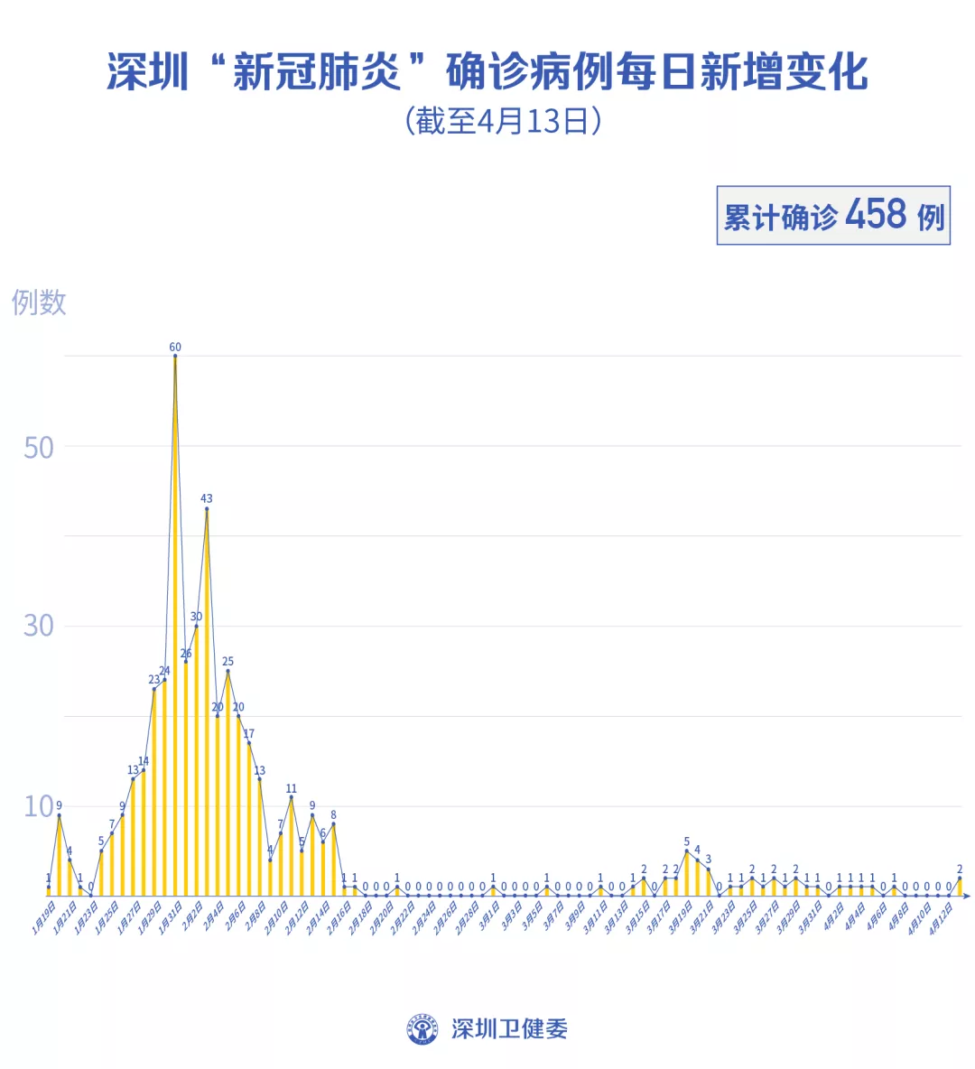 截至4月13日24時,深圳累計報告新冠肺炎病例458例。4月13日當天新增2例境外輸入病例,新增無癥狀感染者1例,出院1例。