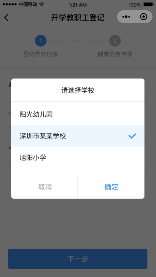 ②點擊“馬上登記”按鈕,填寫學校管理員姓名和手機號碼(學校管理員姓名和手機號碼請詢問學校獲得)后點擊“下一步”,然后選擇對應的學校。