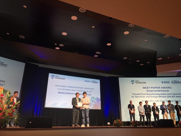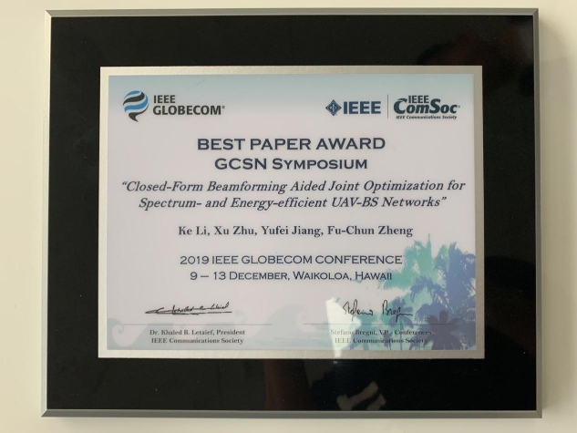 日前,由哈工大(深圳)電子與信息工程學院2017級碩士研究生李可擔任第一作者,朱旭教授、蔣宇飛助理教授、鄭福春教授為共同作者,哈工大(深圳)為第一通訊單位完成的論文《三維波束成形輔助的高譜效和能效的無人機基站網絡的聯(lián)合優(yōu)化》(“Closed-Form Beamforming Aided Joint Optimization for Spectrum- and Energy-Efficient UAV-BS Networks”)入選通信領域頂級會議Globecom2019 (IEEE Global Communications Conference2019),并獲得最佳論文獎。