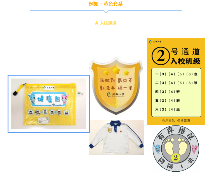 學(xué)校將教學(xué)區(qū)劃分為“綠黃藍(lán)”三區(qū),并精心設(shè)計了帶有濱海元素的“三色”入校通道、三色盾牌、三色貼紙等!