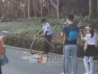 最近,兩條體型碩大的蛇突然在蓮花山公園人行道旁邊的草叢出沒,隨后,一名公園內(nèi)的保安人員徒手捕捉了兩條蛇。