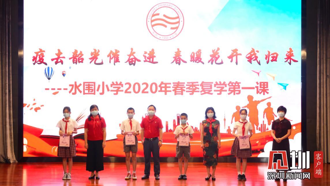 疫情期間,水圍小學(xué)“停課不停學(xué),停課不停教”,進(jìn)行了為期三個(gè)月的線上教學(xué)。在線上學(xué)習(xí)的這段時(shí)間里,學(xué)校涌現(xiàn)了一批在德智體美勞各方面表現(xiàn)優(yōu)異的同學(xué),他們被評(píng)為水圍小學(xué)“紅領(lǐng)巾十星”,區(qū)教科院李楠、衛(wèi)生健康副校長(zhǎng)明昭、校長(zhǎng)劉銳娟、校長(zhǎng)李月琴副與副校長(zhǎng)楊禹清在此次“復(fù)課典禮”中為獲獎(jiǎng)學(xué)生代表頒獎(jiǎng),并在典禮的最后,為在場(chǎng)的學(xué)生代表發(fā)放了暖心包。