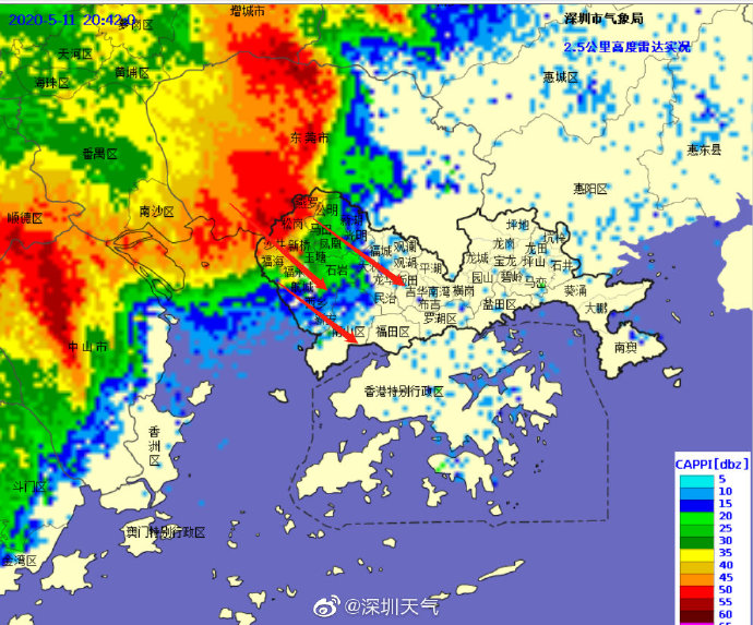 21時49分:目前強雷雨云團已給寶安、光明、龍華、南山、福田等區(qū)域帶來強雷雨和大風,預(yù)計即將影響羅湖、鹽田、龍崗、坪山和大鵬,將帶來小時雨量30毫米左右的降雨以及8-9級的短時大風,請注意防御。