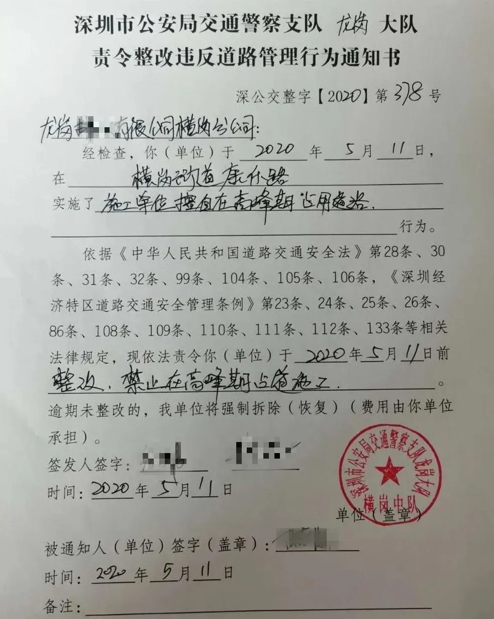 龍崗**有限公司橫崗分公司擅自在高峰期占用道路施工,執(zhí)勤民警責(zé)令立即整改、撤離現(xiàn)場(chǎng)。