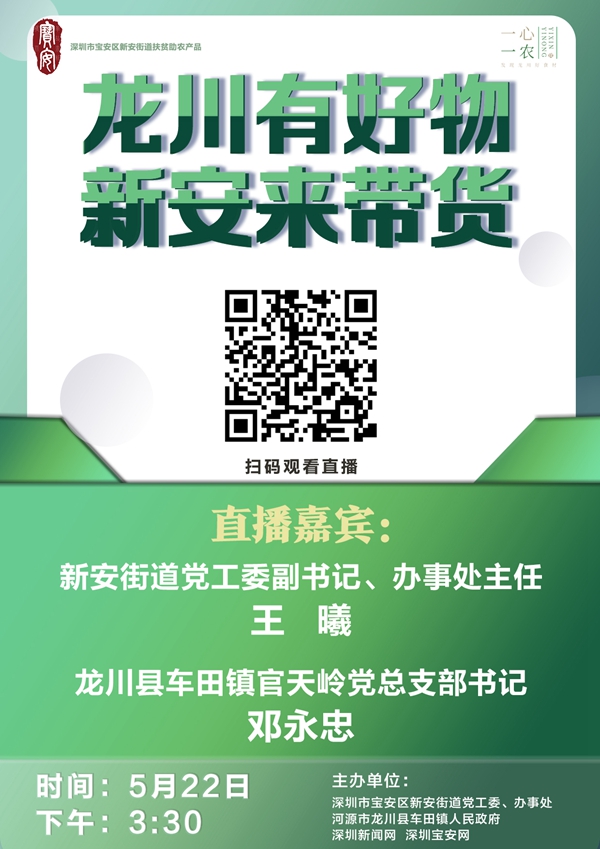 5月22日下午3:30,新安街道黨工委副書(shū)記、辦事處主任王曦、龍川縣車(chē)田鎮(zhèn)官天嶺村支部書(shū)記鄧永忠還將作客深圳新聞網(wǎng)直播間,向網(wǎng)友推介綠殼雞蛋、黑豆腐竹、生態(tài)米、牛海花生等優(yōu)質(zhì)農(nóng)產(chǎn)品,通過(guò)電商打通貧困村農(nóng)產(chǎn)品銷(xiāo)售渠道。歡迎觀看,不見(jiàn)不散!