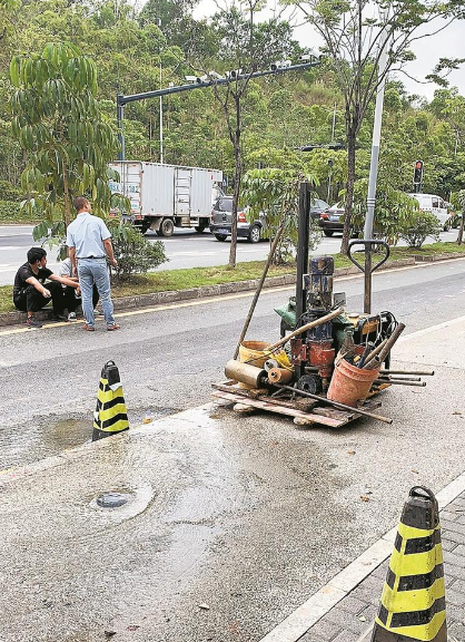 2020年5月1日,執(zhí)法支隊龍崗大隊執(zhí)法人員在轄區(qū)內(nèi)值班巡查時,接到投訴稱愛南路上海外國語學校門口有道路施工人員鉆探時鉆破水管,現(xiàn)場水流滿地,請求執(zhí)法人員前往調查。