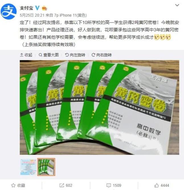 前段時間,支付寶發(fā)布了學雜費支持分期的微博,評論里有家長在呼喚學習資料,所以花唄產品經理決定除了學雜費分期,再買2噸黃岡密卷送人。