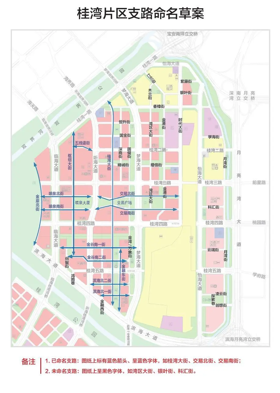 本次命名草案按照相關(guān)法規(guī)文件,結(jié)合前海桂灣、前灣、媽灣各片區(qū)的規(guī)劃定位、功能布局以及建設(shè)情況,針對(duì)三大片區(qū)和重要功能區(qū)功能、項(xiàng)目布局等特征,對(duì)前海15平方公里支路進(jìn)行了全覆蓋命名。