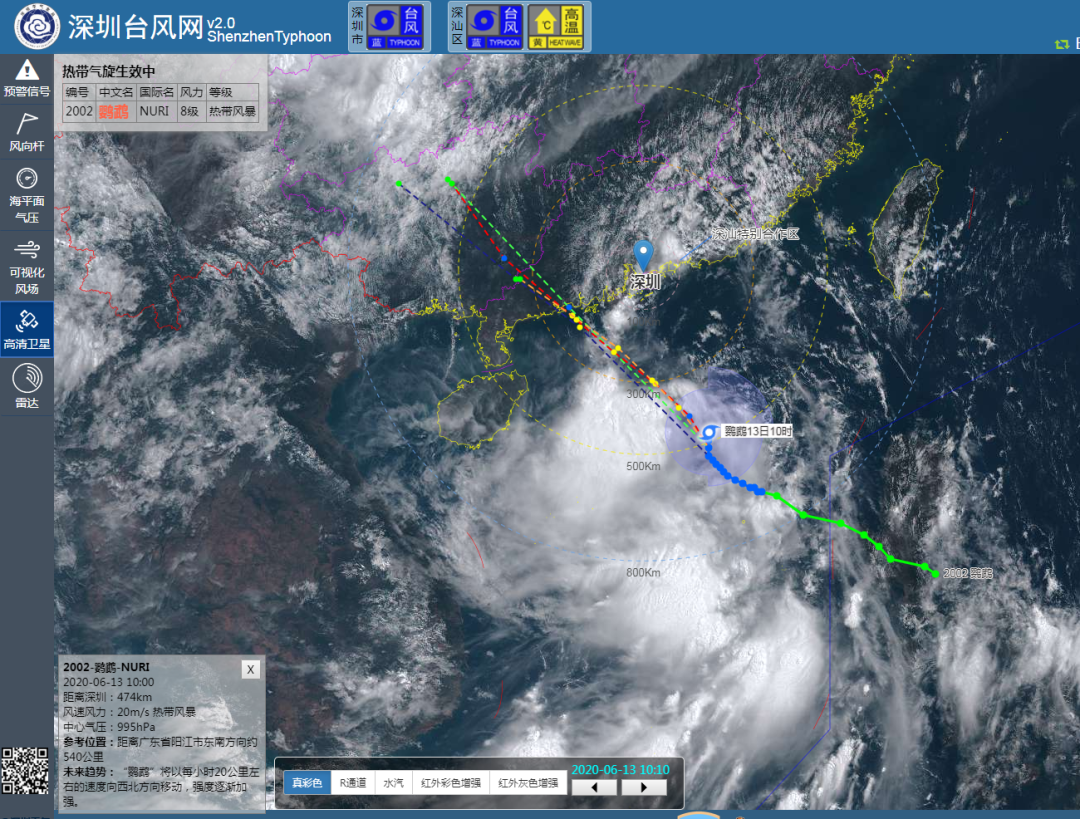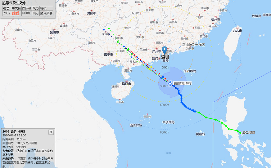 深圳市氣象臺(tái)2020年06月13日15時(shí)30分發(fā)布:6月13日15時(shí)臺(tái)風(fēng)“鸚鵡”(熱帶風(fēng)暴級(jí))位于深圳市偏南方約387公里南海海面上,中心附近最大風(fēng)力8級(jí)。預(yù)計(jì)其將繼續(xù)向西北方向移動(dòng),14日白天趨向江門(mén)至茂名海域,最大可能以強(qiáng)熱帶風(fēng)暴級(jí)在陽(yáng)江附近登陸。我市13日17時(shí)后起風(fēng)力逐漸加大,13日夜間至14日上午為風(fēng)雨主要影響時(shí)段,有大雨到暴雨,沿海和海區(qū)最大陣風(fēng)8-10級(jí)。目前臺(tái)風(fēng)藍(lán)色和雷電預(yù)警信號(hào)生效中。
