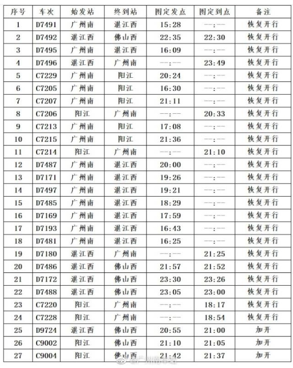 其中,廣州南站恢復(fù)開(kāi)行列車(chē)24趟,其中始發(fā)列車(chē)14趟,跨線列車(chē)4趟,終到列車(chē)6趟;同時(shí)加開(kāi)跨線列車(chē)3趟,恢復(fù)開(kāi)行和加開(kāi)列車(chē)共計(jì)27趟。