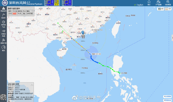 6月13日12時(shí)臺(tái)風(fēng)“鸚鵡”(熱帶風(fēng)暴級(jí))位于深圳市東南方大約446公里的海面上,中心附近最大風(fēng)力8級(jí)。未來(lái)24小時(shí)趨向江門(mén)至茂名附近海域,最大可能在陽(yáng)江附近登陸。我市13日17時(shí)前后起風(fēng)力逐漸加大,13日夜間至14日上午為風(fēng)雨主要影響時(shí)段。目前臺(tái)風(fēng)藍(lán)色預(yù)警信號(hào)生效中。深圳市氣象臺(tái)2020年06月13日12時(shí)35分發(fā)布。