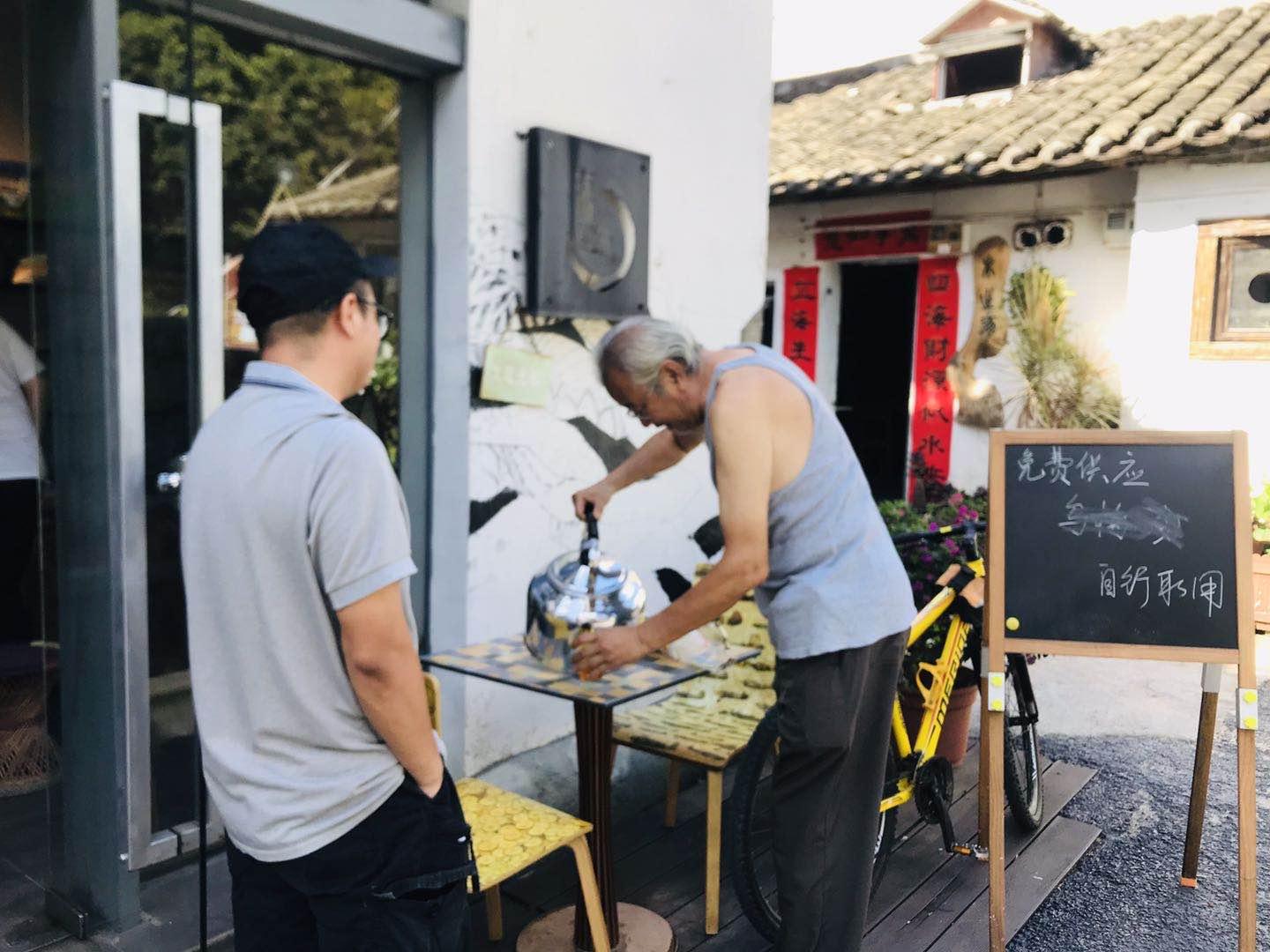 一張桌子、兩把椅子、一壺水就是一個(gè)涼茶點(diǎn),一旁支起的黑板上還寫著“免費(fèi)供應(yīng)、自行取用”八個(gè)字。這里的涼茶從下午三點(diǎn)半開始準(zhǔn)時(shí)向過往行人免費(fèi)提供,一直到晚上七八點(diǎn)。愛心涼茶供應(yīng)點(diǎn)的發(fā)起人叫陳小林,熟悉他的人都稱呼他小林哥。