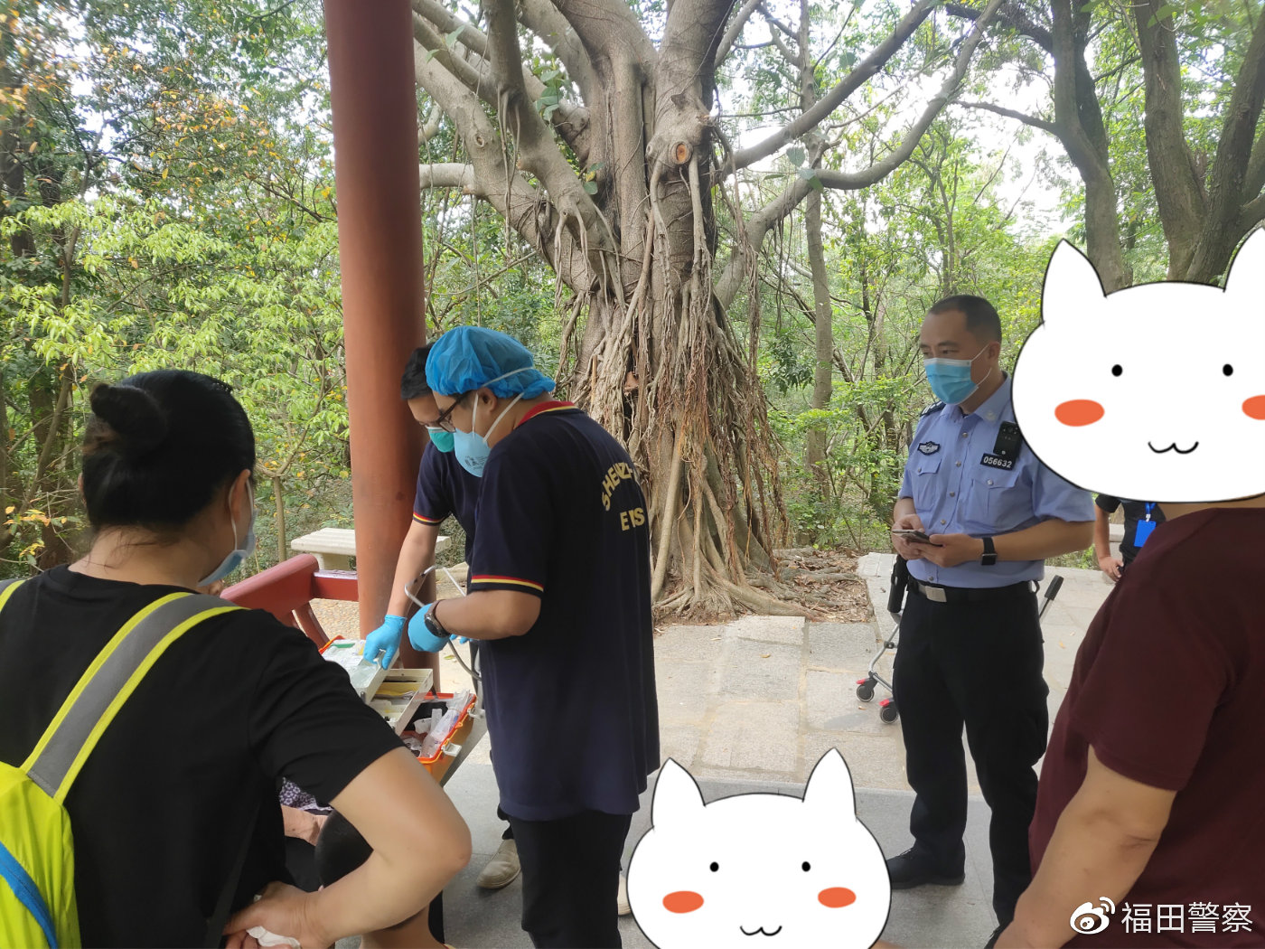 13時許,接派出所前臺指令,報稱一老人身體不適請求幫助后,民警立即趕到現(xiàn)場,協(xié)助120醫(yī)務人員進行檢查。檢查完畢后,民警為老人遞上一杯水,并在確認老人身體無礙后,將其護送下山。