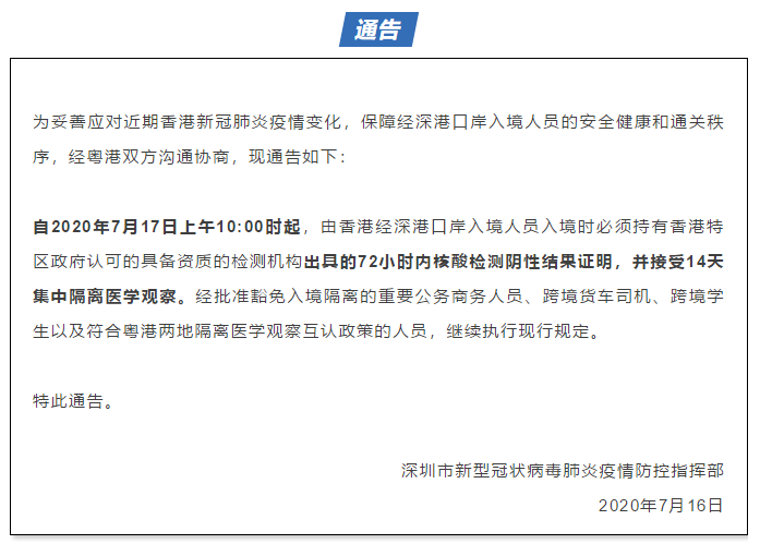 1、7月16日晚間,深圳市新型冠狀病毒肺炎疫情防控指揮部調整由香港經(jīng)深港口岸入境人員防控措施,由香港口岸入境人員須持72小時內(nèi)核酸檢測陰性結果證明,并接受14天集中隔離醫(yī)學觀察。