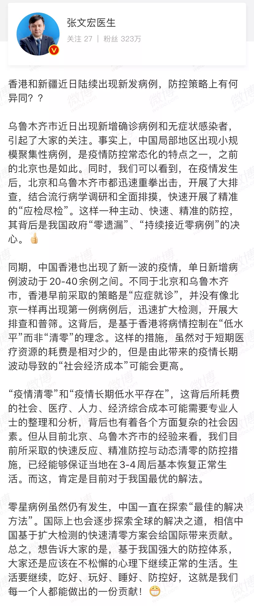 7月18日8時許,上海復(fù)旦大學(xué)附屬華山醫(yī)院感染科主任@張文宏醫(yī)生在微博上就“香港和新疆近日出現(xiàn)新發(fā)病例”發(fā)聲。