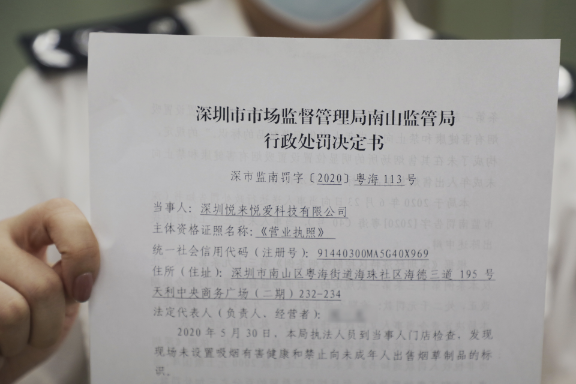 經過近2個月的調查,7月21日,深圳悅來悅愛科技有限公司正式簽收深圳市市場監(jiān)督管理局南山分局粵海所開出的行政處罰決定書,罰款2000元。
