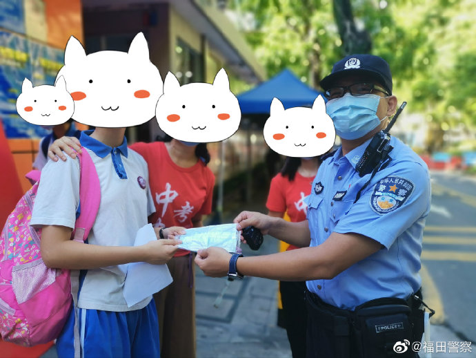 7月21日,深圳中考第二天,景田派出所社區(qū)民警一早就在各考場外為考生們保駕護(hù)航。當(dāng)社區(qū)民警趙廣生看見一名忘記佩戴口罩的考生時(shí),立即取出身上的備用口罩遞給她,使得考生順利進(jìn)入考場參加考試。福田警方溫馨提醒:乘風(fēng)破浪的同時(shí),也要做到考試防疫兩不忘。少年們,下午的考試?yán)^續(xù)加油吧!