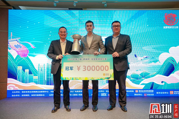 薛江與舒立共同為趙鑫鑫頒發(fā)獎(jiǎng)牌與賽事獎(jiǎng)金。趙鑫鑫在發(fā)表賽后感言時(shí)說道,今年疫情的大背景下賽事少,“鵬城杯”辦得非常好。他也表示,在一年的最后一天下棋對弈非常難得,希望明年再進(jìn)一步。