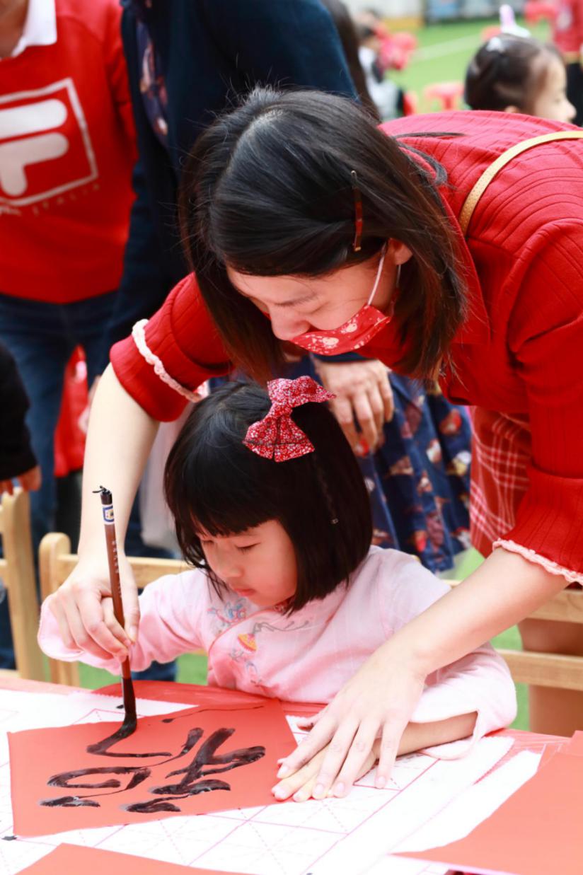 大手握小手,一起寫“福”字。