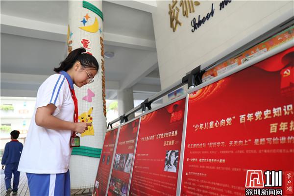 記者首先來到羅湖區(qū)翠北實驗小學,主題展板位于學校一樓大廳,有很多同學會在下課的時間來這里觀看學習。學校社工邱女士參與設計本次活動的時候想到,黨史對孩子們比較遙遠,想要讓孩子們深入學習就不能用大人的方式死板教條的灌輸,要調動孩子們的積極性,讓孩子們自己做“小講師”。
