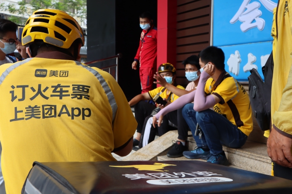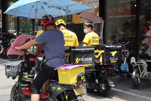 記者看到,街道上像呂先生這樣的外賣員數(shù)量不在少數(shù),短短十幾分鐘,記者就看到了近百名外賣員、派送員穿行街頭,將訂單送達(dá)客戶手中。他們趁取餐時(shí)間,在餐廳門(mén)口休息,不少人直接席地而坐,享受一下開(kāi)放餐廳流出的一絲冷氣。