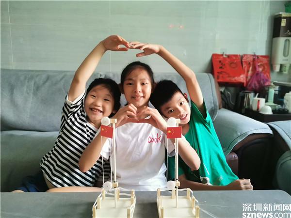 當(dāng)天下午,20位回答了問題的小朋友得到了獎(jiǎng)品,一個(gè)大大的工具包。他們要將工具包帶回家,自己動(dòng)手,拼裝一個(gè)五星紅旗升降臺(tái)。吳燕柔姐弟三人第一個(gè)完成,他們一起在家中舉行升旗儀式。姐姐慢慢搖動(dòng)升降臺(tái)的把手,三雙大眼睛盯著冉冉升起的五星紅旗,齊聲唱響了國歌。姐姐升完了弟弟再升,三人輪流一番,國歌也就一遍遍響起。意猶未盡之際,姐弟三人還比了一個(gè)大大的心,與自己親手制作的五星紅旗升降臺(tái)合影。