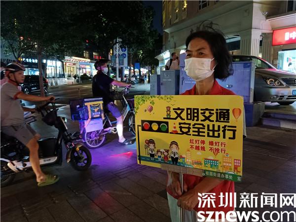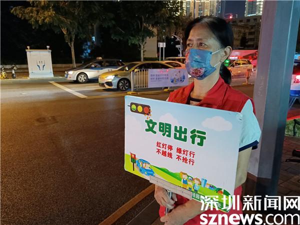 另一位堅守在國慶假期里的義工是宣仲英,今年62歲。她一站兩個小時,始終是精神抖擻,毫不松懈??吹接腥嗽噲D闖紅燈,她及時制止。看到有人不走斑馬線,她立刻提醒。她手持勸導(dǎo)文明出行的牌子,就像個交通警察,誰也別想在她的面前犯規(guī)。本來下午6點鐘,正是她給家人做晚餐,同家人一起吃飯的時間,但她聽說社區(qū)創(chuàng)文需要人,就跟家人商量,得到了家人的一致同意。她說,“我從內(nèi)地來到深圳,在老圍社區(qū)住了10年,感覺深圳做義工的氛圍特別濃厚,我也想做義工,為社會發(fā)揮余熱?!?/span>