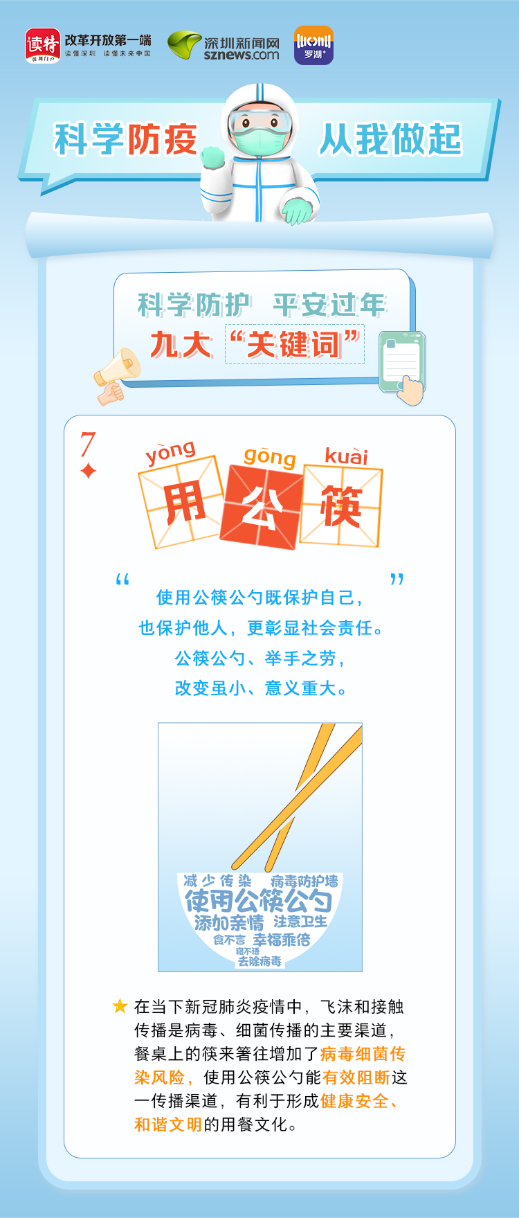 為更好地保護(hù)自己和他人的健康,度過(guò)一個(gè)祥和平安的春節(jié),請(qǐng)查收《科學(xué)防護(hù)平安過(guò)年九大“關(guān)鍵詞”》。在這場(chǎng)沒(méi)有硝煙的戰(zhàn)斗中,公安干警、醫(yī)護(hù)人員、社區(qū)工作者、志愿者始終堅(jiān)守在一線,齊心協(xié)力、眾志成城抗擊疫情。讓我們攜手并進(jìn),共同抗疫,采用科學(xué)有效的方式做好自身防護(hù),不僅對(duì)自己負(fù)責(zé),更是對(duì)家人負(fù)責(zé),對(duì)社會(huì)負(fù)責(zé)。