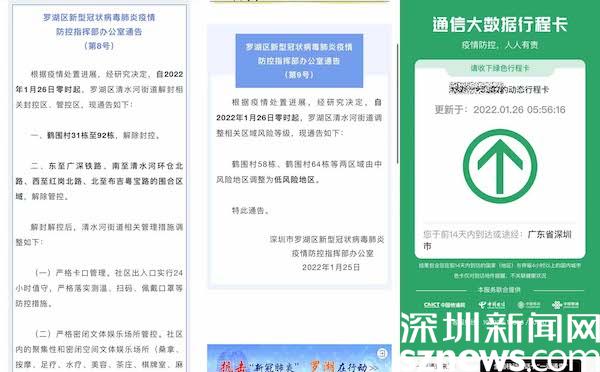 讀特客戶端·深圳新聞網(wǎng)1月26日訊(記者 覃鈺清)1月25晚,羅湖區(qū)新型冠狀病毒肺炎疫情防控指揮部辦公室發(fā)出通告,通告指出,自2022年1月26日零時(shí)起,羅湖區(qū)清水河街道解封相關(guān)封控區(qū)、管控區(qū),同時(shí)調(diào)整羅湖區(qū)清水河街道鶴圍村58棟、鶴圍村64棟等兩區(qū)域由中風(fēng)險(xiǎn)地區(qū)調(diào)整為低風(fēng)險(xiǎn)地區(qū)。調(diào)整后,深圳市全域均為低風(fēng)險(xiǎn)地區(qū),不再執(zhí)行“持48小時(shí)核酸陰性證明離深”管控措施。
