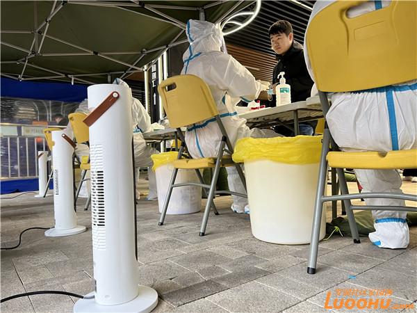 十分鐘后,物資配送車輛來到萬科里核酸檢測點,工作人員將熱乎乎的姜茶送到工作人員手中,并熟練地尋找合適的地方架起暖風機。“從周末的暖寶寶,到今天的暖風機,暖心行動一再升級,感覺很驚喜?!绷_湖醫(yī)院護士劉新媚向記者說道,目前疫情防控工作任務艱巨,檢測點周末也在連續(xù)運轉(zhuǎn),但街道及時的物資保障,讓所有一線人員都感覺很暖心。