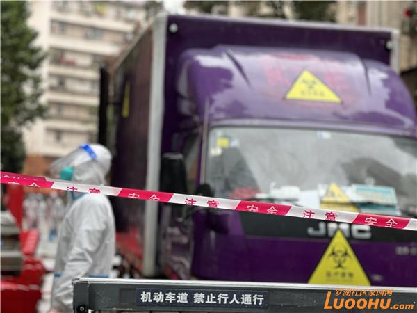 2月22日早上,記者來到處于管控區(qū)域的桂園街道鹿苑小區(qū)。只見身穿防護(hù)服的“大白”們來來往往地在門口忙碌著,偶爾有外賣小哥將外賣放在小區(qū)入口的貨架上便離開,雨水打濕了門前拉起的紅色警戒線。鹿丹村社區(qū)黨委書記陳姍姍披著簡單的一次性雨衣,不斷響起的電話,居民的一聲聲詢問,都是她需要盡快處理的各項管控工作。