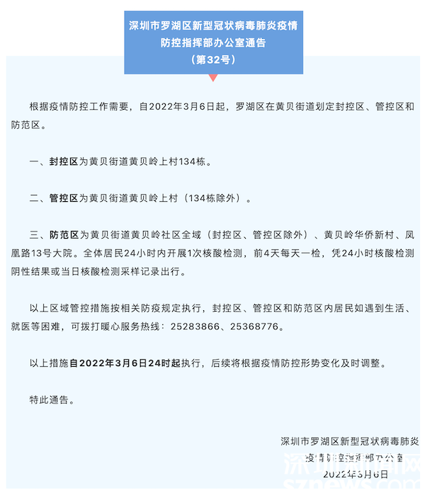 夜間,深圳市羅湖區(qū)新型冠狀病毒肺炎疫情防控指揮部辦公室發(fā)出通告,自即日起,在黃貝街道劃定封控區(qū)、管控區(qū)和防范區(qū)。