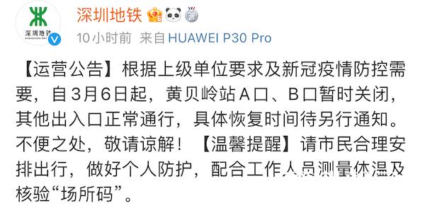 上午8時(shí),深圳地鐵發(fā)布運(yùn)營公告:3月6日起,黃貝嶺站A口、B口暫時(shí)關(guān)閉,其他出入口正常通行。