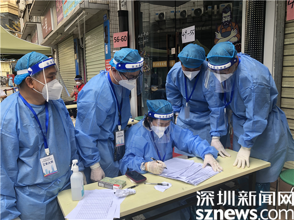 3月22日,黃貝嶺下村封控區(qū),婦聯(lián)抗疫隊員們分成幾個小組,上門為居民登記信息,協(xié)助醫(yī)護人員采核酸,這是他們第二天在同一地址上門服務。