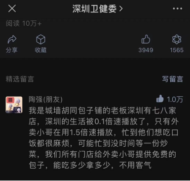 記者注意到,陶先生讓外賣小哥免費(fèi)吃包子,最早引發(fā)關(guān)注,是源自疫情特殊時(shí)期他在深圳衛(wèi)健委下的一條留言:“外賣小哥在用1.5倍速播放,忙到他們想吃口飯都很麻煩,可能忙到?jīng)]時(shí)間等一份炒菜,我們所有門店給外賣小哥提供免費(fèi)的包子,能吃多少拿多少,不用客氣。”
