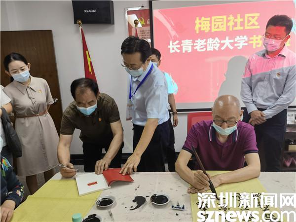 現(xiàn)場(chǎng),還邀請(qǐng)了梅園社區(qū)長(zhǎng)青老齡大學(xué)書(shū)法班鄒洪濤老師向大家講解,鄒洪濤既是書(shū)法班的老師,也是社區(qū)第十黨支部的支部書(shū)記,更是一名基建工程老兵。當(dāng)鄒洪濤介紹家喻戶曉的照片《升》的主人公正是他本人,更是讓王云虎對(duì)他豎起了大拇指。他激動(dòng)地表示,鄒洪濤的紅嶺大廈建筑工地上被定格的這張“頂天立地”的照片,是基建工程兵傾力投身改革開(kāi)放的縮影,展示了深圳經(jīng)濟(jì)特區(qū)初創(chuàng)時(shí)蒸蒸日上的發(fā)展勢(shì)頭,是深圳建設(shè)初期時(shí)代張力的見(jiàn)證。