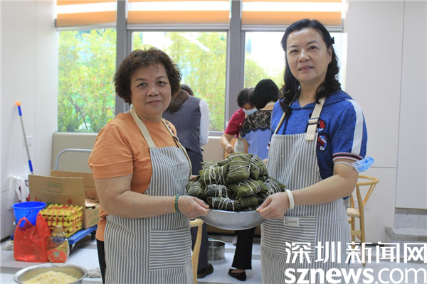 一起包粽子的30名“大廚”中,有社區(qū)居民,也有轄區(qū)企業(yè)員工。年齡最大的73歲,是老圍社區(qū)的蔡屋圍村民,年齡最小的25歲,是轄區(qū)企業(yè)員工。只見她們圍桌而立,雙手包著粽子,嘴里說著家常,臉上帶著笑,沒多大工夫,一個個有棱有角的粽子就在大盆里堆成了小山。每一顆粽子都有家的味道,都帶著滿滿的祝福和對美好生活的憧憬。不少居民在老圍社區(qū)出生長大,一住就是一輩子,她們見證了社區(qū)家園日新月異的變化,她們熱愛這塊土地,熱愛老圍社區(qū)。