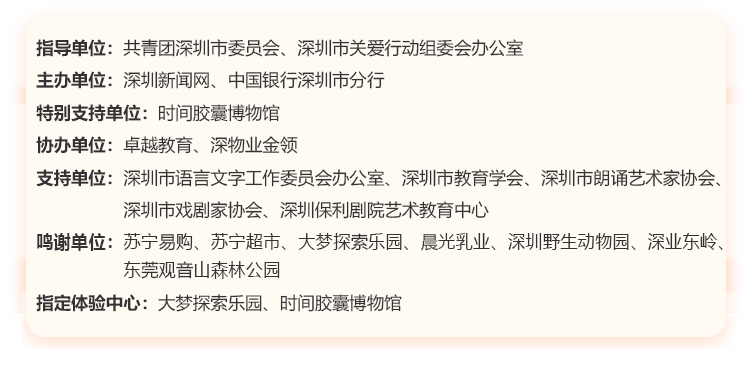 讓閱讀成為動人的風景,讓故事的魅力感動深圳。為助力建設良好的青少年閱讀環(huán)境,激發(fā)學生閱讀興趣,倡導親子閱讀,共建和諧家庭關系。2020年,第二十一屆深圳讀書月主題活動“誰是故事大王·第四季”在共青團深圳市委員會、深圳市關愛行動組委會辦公室的指導下再出發(fā)。更長的活動周期,更豐富的參與形式,更專業(yè)的賽制,“誰是故事大王·第四季”等你來解鎖與挑戰(zhàn)!
