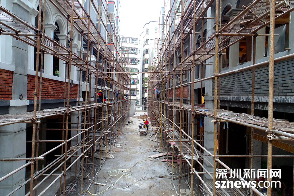 12月14日下午,水圍村改造的村民房的建筑鋼架還沒有拆除,建筑工人正在對外立面進(jìn)行粉刷