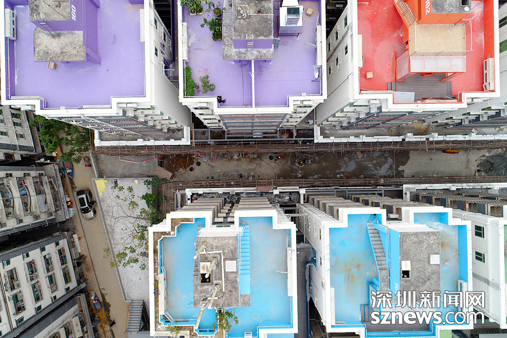 從高空俯瞰,除了能看到色彩繽紛的屋頂,也能看到握手樓之間緊湊的縫隙