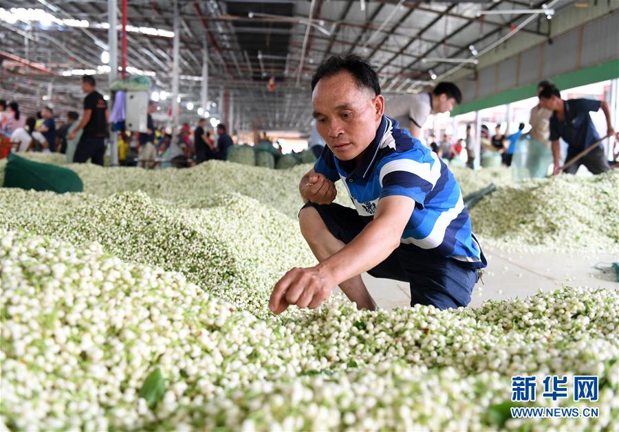日前,“中國茉莉之鄉(xiāng)”廣西橫縣茉莉花全面進入采摘上市期,當?shù)剀岳蚧ǚN植園和交易市場一片繁忙。據(jù)介紹,橫縣茉莉花種植面積達10.5萬畝,花農(nóng)約33萬人,年產(chǎn)茉莉鮮花8.5萬噸,有130多家花茶企業(yè),年產(chǎn)茉莉花茶6.5萬噸。新華社記者陸波岸 攝